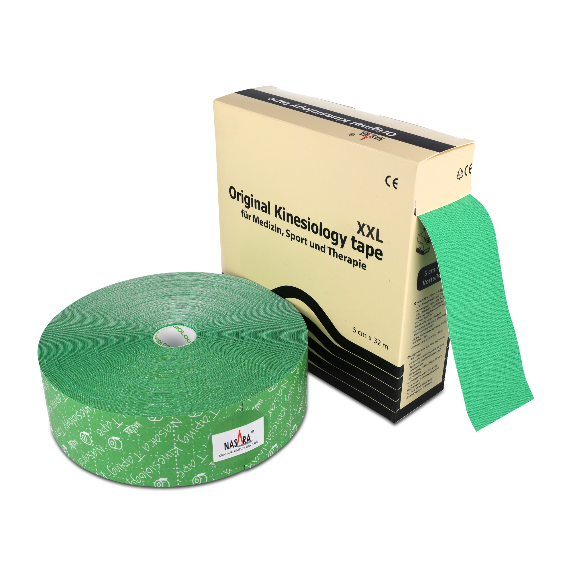 Spezial-Rollenmaß 5 cm x 32 m Rolle Bei regelmäßiger Verwendeung in der Physiotherapie, in Kliniken und Reha-Zentren sowie Arztpraxen Original Kinesiology Tape von NASARA®. Eines der erfolgreichsten und besten Tapes auf dem Weltmarkt mit hervorragenden Klebeeigenschaften. Eigenschaften Das Tape ist aus 96% Baumwolle, 4% Elastan. Der reine, hautfreundliche Acrylatkleber wird in Wellenform aufgebracht. Das Tape lässt sich gut verarbeiten und präzise kleben. Das Tape ist luft- / wasserdurchlässig, aber wasserbeständig und ermöglicht über die gesamte Tragezeit hohen Komfort und sehr gute Hautverträglichkeit. Original NASARA Tape wird u.a. von der Deutschen Gesellschaft für angewandte Sportmedizin empfohlen und wird in zahlreichen Olympiastützpunkten, Bundesligamannschaften und von Top Athleten verwendet. Für Therapeuten und Ärzte gelten Sonderkonditionen!